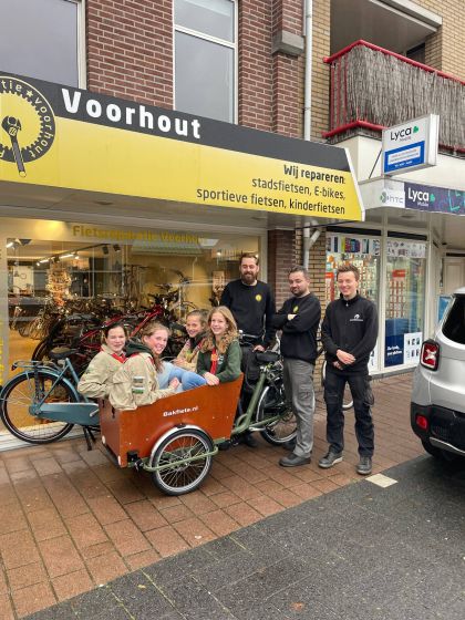 Vandaag hebben we de bakfiets opgehaald bij Fietsreparatie Voorhout. De padvindsters die mee waren, zijn in ieder geval al mega-enthousiast. Logisch, want kijk nou wat een plaatje!